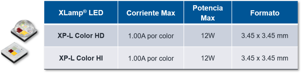 - Superficie de emisión (LES) 33% más pequeña que los LEDs existentes XLamp® XM-L Color Gen 2
