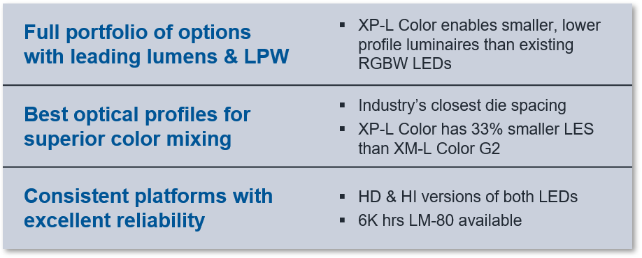June 25, 2024New XLamp® XP-L Color LEDs enable smaller, lower profile color-mixing luminaires