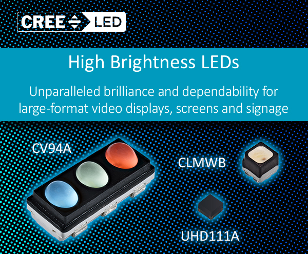 This high brightness LED features a small 1.6 x 1.7 mm footprint, has a wide viewing angle and is optimized for high-resolution outdoor LED video screens, such as stadium displays and advertising displays. Both CV94A-FGC and CLMWB-FKC LEDs are IPx8 waterproof rated and feature UV inhibitors to increase reliability in extreme weather conditions.