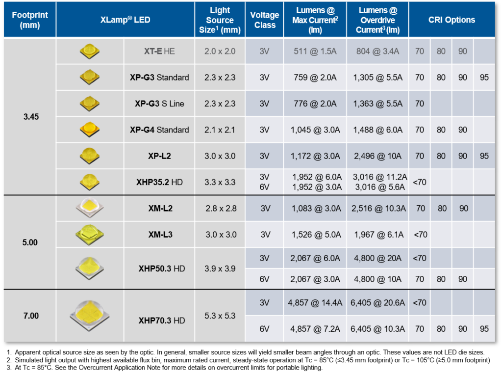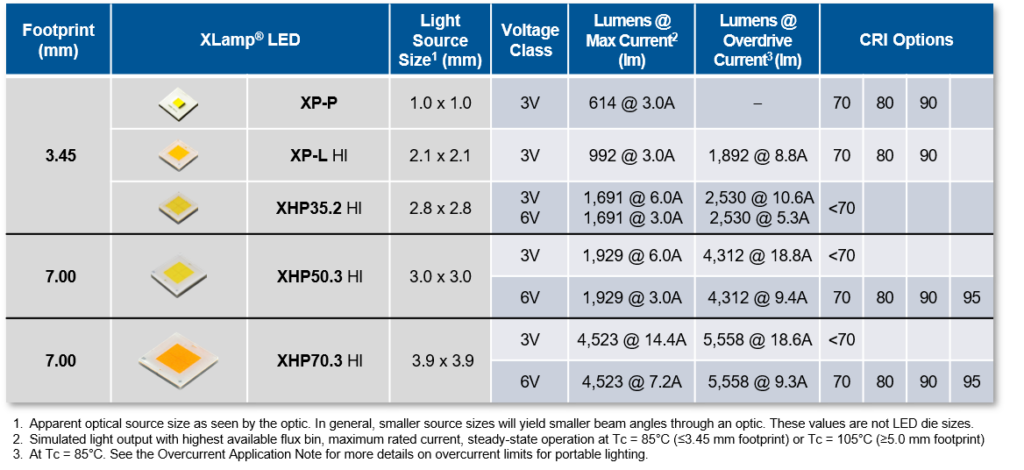 Cree LED continues to expand its XLamp® XHP White LED family with new 3V options available for all 6 XHP products. XHP LEDs deliver industry-leading lumen density, light quality and optical control for portable lighting applications. All 3V versions are available with 5000K-7000K CCT options optimized for maximum performance.