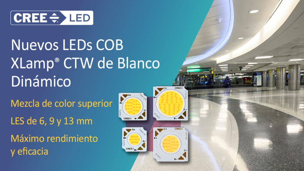 Los LEDs COB de blancos dinámicos XLamp CTW de Cree LED destacan por su excepcional densidad lumínica, eficiencia energética y versatilidad de aplicación. Estos dispositivos presentan el área emisora de luz (LES) más compacta de su categoría, junto con una compatibilidad óptica superior que simplifica el desarrollo de sistemas de iluminación con temperatura de color ajustable in situ.
