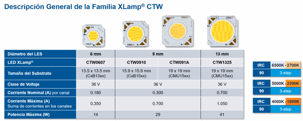 La familia XLamp CTW representa la nueva generación de LEDs COB de blancos dinámicos con arquitectura de dos canales, estableciendo nuevos estándares en versatilidad, densidad lumínica, eficiencia energética y confiabilidad operativa. Especialmente desarrollados para luminarias que integran ópticas secundarias direccionales, estos componentes habilitan un amplio espectro de temperaturas de color blanco y proporcionan una experiencia dim-to-warm excepcional para aplicaciones finales.