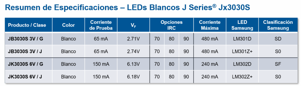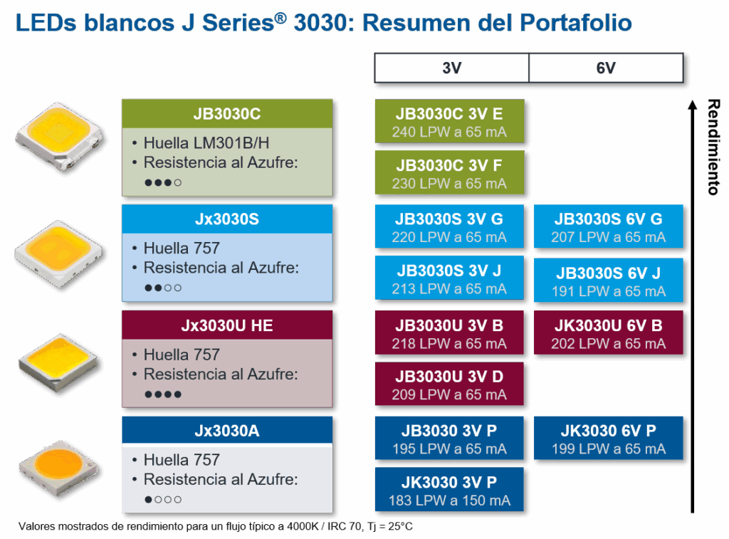 - Eficacia sobresaliente: Hasta 220 LPW (JB3030S 3V G-CLass) y 207 LPW (JK3030S 6V G-Class) a 65 mA