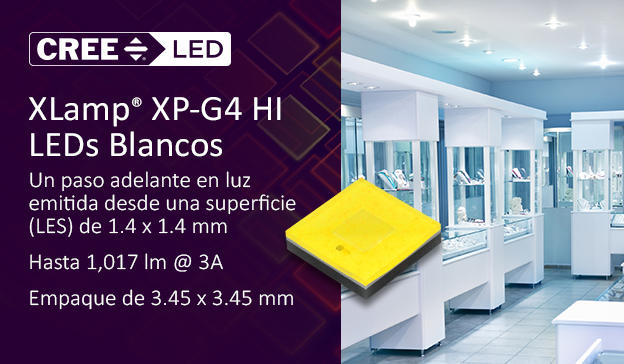Con una mayor emisión del luz y eficacia en comparación a las opciones dentro de la familia XLamp® con misma superficie (LES), los LEDs XP-G4 HI están optimizados para un máximo rendimiento utilizando una configuración de óptica individual. Los LEDs XP-G4 HI cuentan con el conocido empaque XP de 3.45mm, de huella amplia para disipación térmica (neutral eléctricamente) y con una baja resistencia térmica.