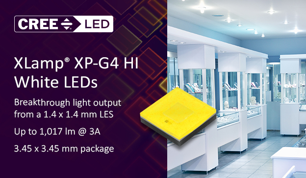 XLamp® XP-G4 High Intensity LEDs provide a new, higher performance option in the small LES XLamp LED portfolio, delivering up to 1,017 lm from a 1.4 x 1.4 mm LES.