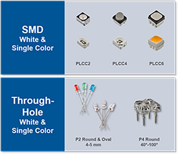 Our high brightness portfolio includes through-hole and surface mount diodes in white and color as well as a variety of multi-color LED options.